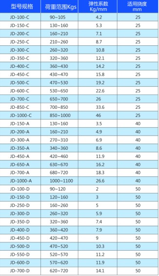JD彈簧減振器產品簡介 JD型彈簧減振器是廠最近開發的一種新穎減震器參照國外空調行業減震器的最新設計,最大的特點是減震效果顯著,結構簡單,安裝方便,是一種無外殼的彈簧減震器。為了保證彈簧橫向穩定,最佳荷載為預壓承載上下40%。